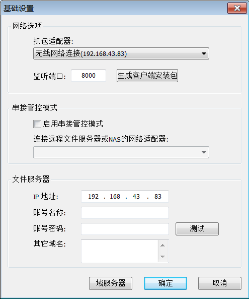 基础配置可以选择普通或串接模式(串接模式可以直连NAS);配置服务器的网卡及登录帐号信息;
