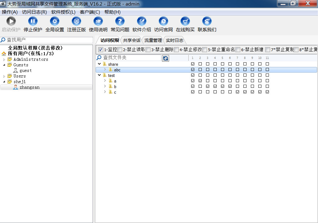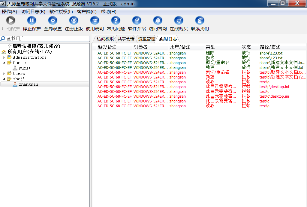 大势至共享文件管理系统是国内专门设置共享文件访问权限、防止共享文件随意复制、修改、删除、下载、另存为本地的专门软件,通过在服务器上安装部署之后,就可以有效控制局域网用户访问共享文件的行为。并且,可以实现只让打开共享文件而禁止另存为本地磁盘、只让修改共享文件而禁止删除共享文件、只让读取共享文件而禁止复制共享文件等,有效保护了共享文件的安全,而且还可以详细记录共享文件访问日志,便于事后备查和审计。大势至局域网共享文件管理系统的详细截图如下: