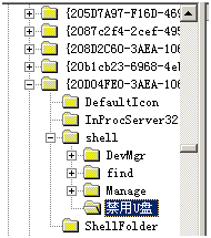 第三步:右击“shell”项并在弹出的菜单中选择“新建/项”命令,把它重命名为“禁用U盘”,同时又新建一个“启用U盘”项